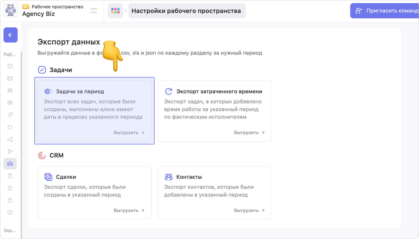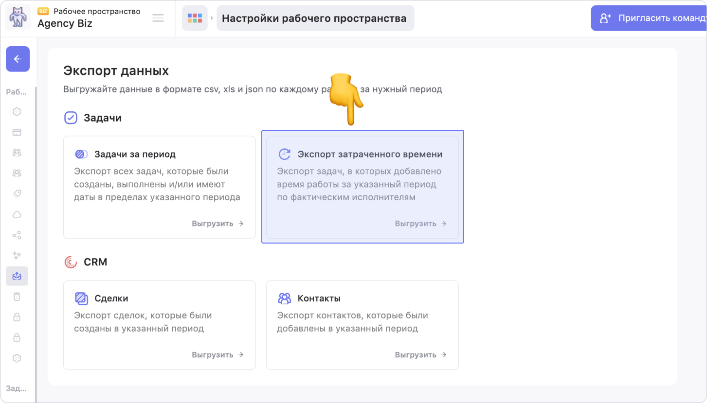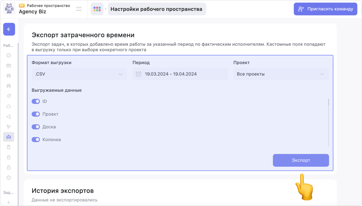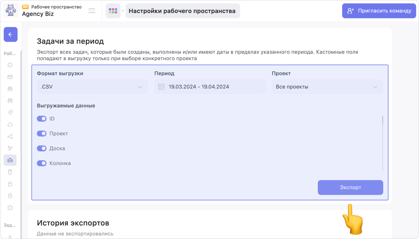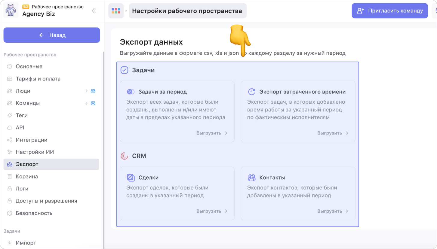 В разделе Экспорт можно выгрузить данные о рабочем пространстве: