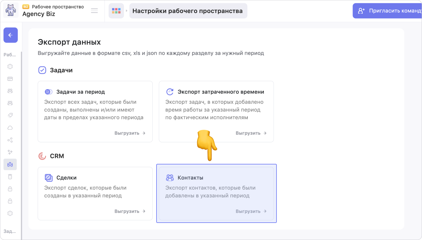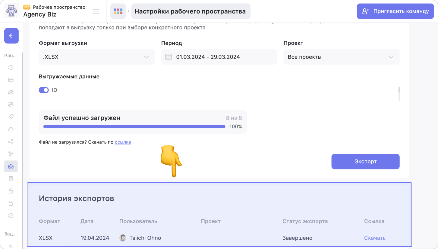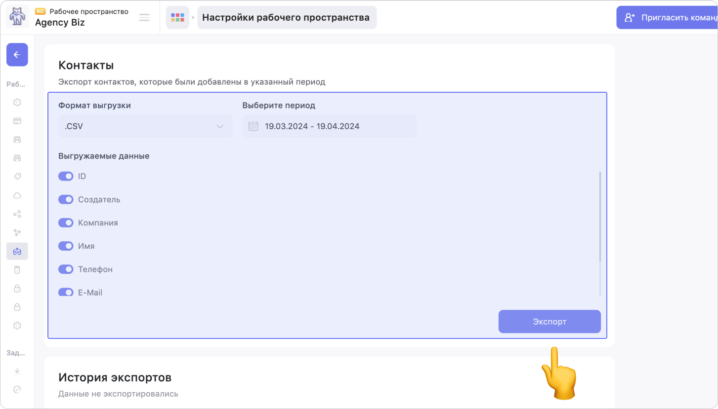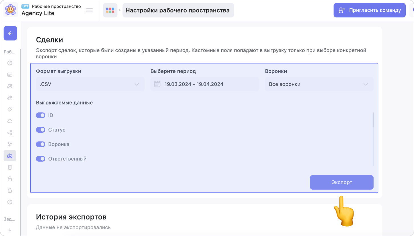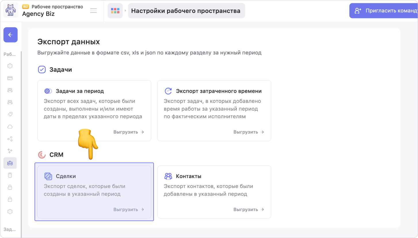В разделе Экспорт можно выгрузить данные о рабочем пространстве: