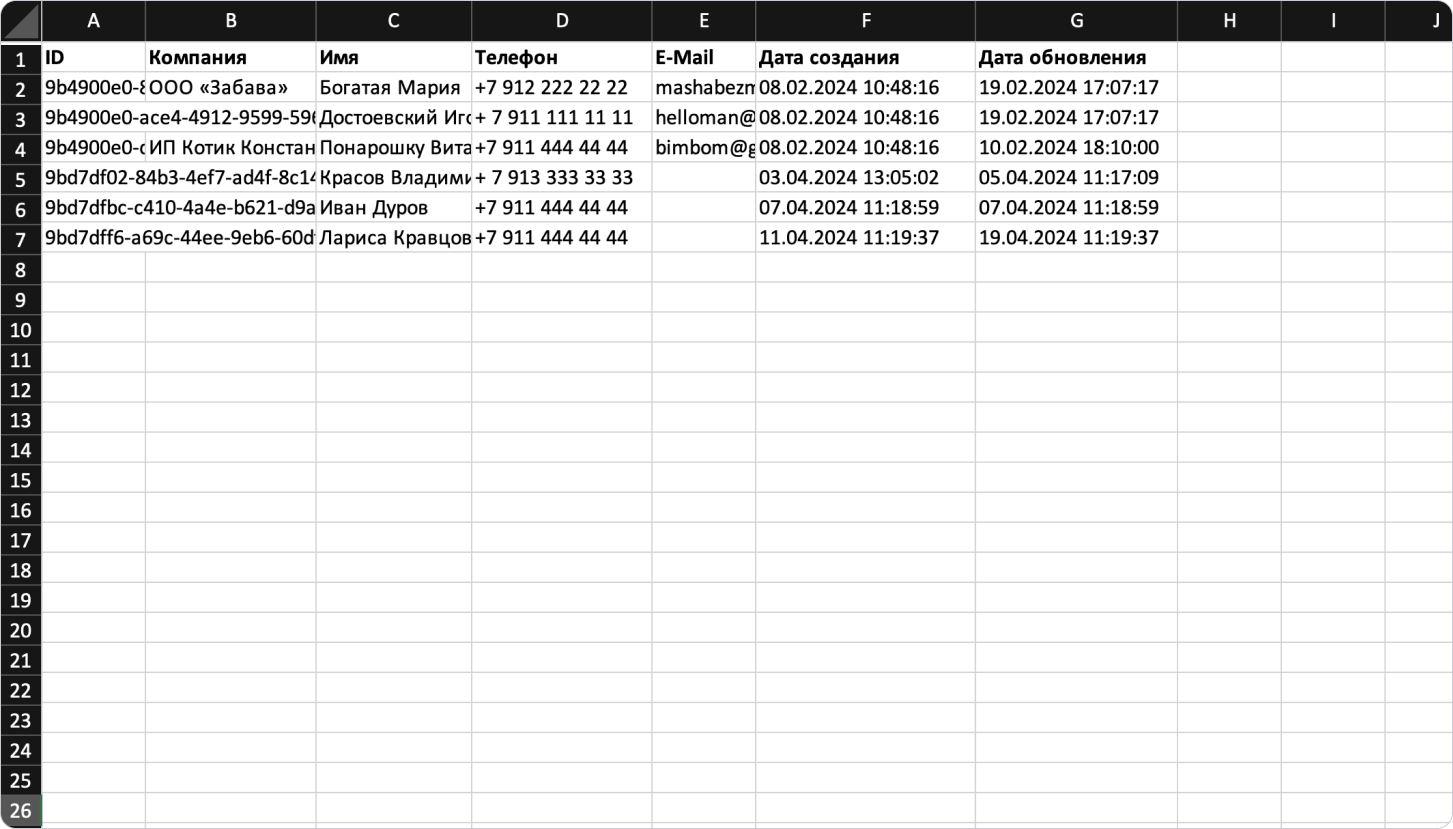 Файл отчёта автоматически загрузится на ваше устройство. Сформированный отчёт содержит данные о контактах, созданных за указанный период.