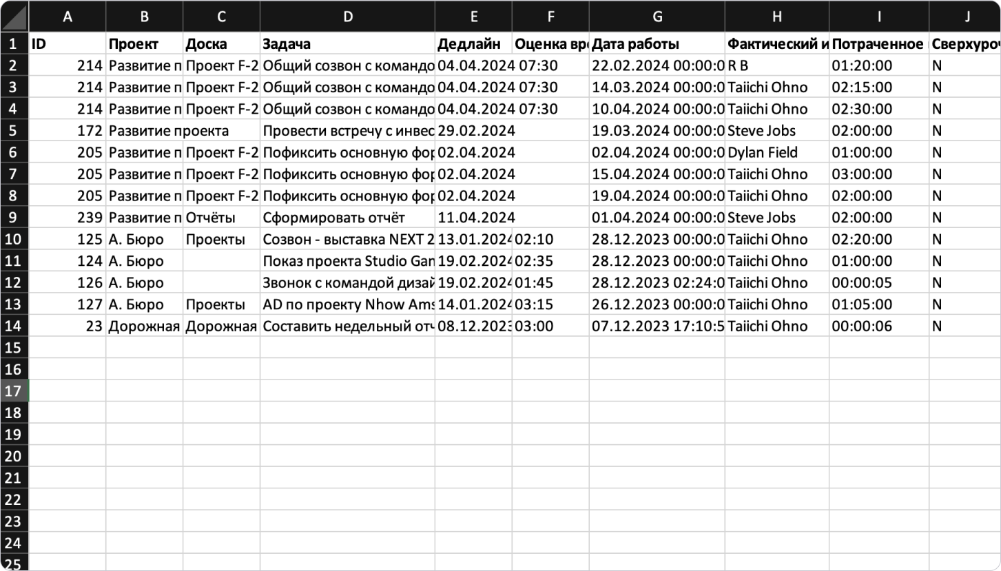 Файл отчёта автоматически загрузится на ваше устройство. Сформированный отчёт содержит информацию о затраченном на задачи времени, фактических исполнителях, времени и дате работы. Каждая запись содержит информацию о зафиксированном включении таймера или внесении информации о затраченном времени вручную.