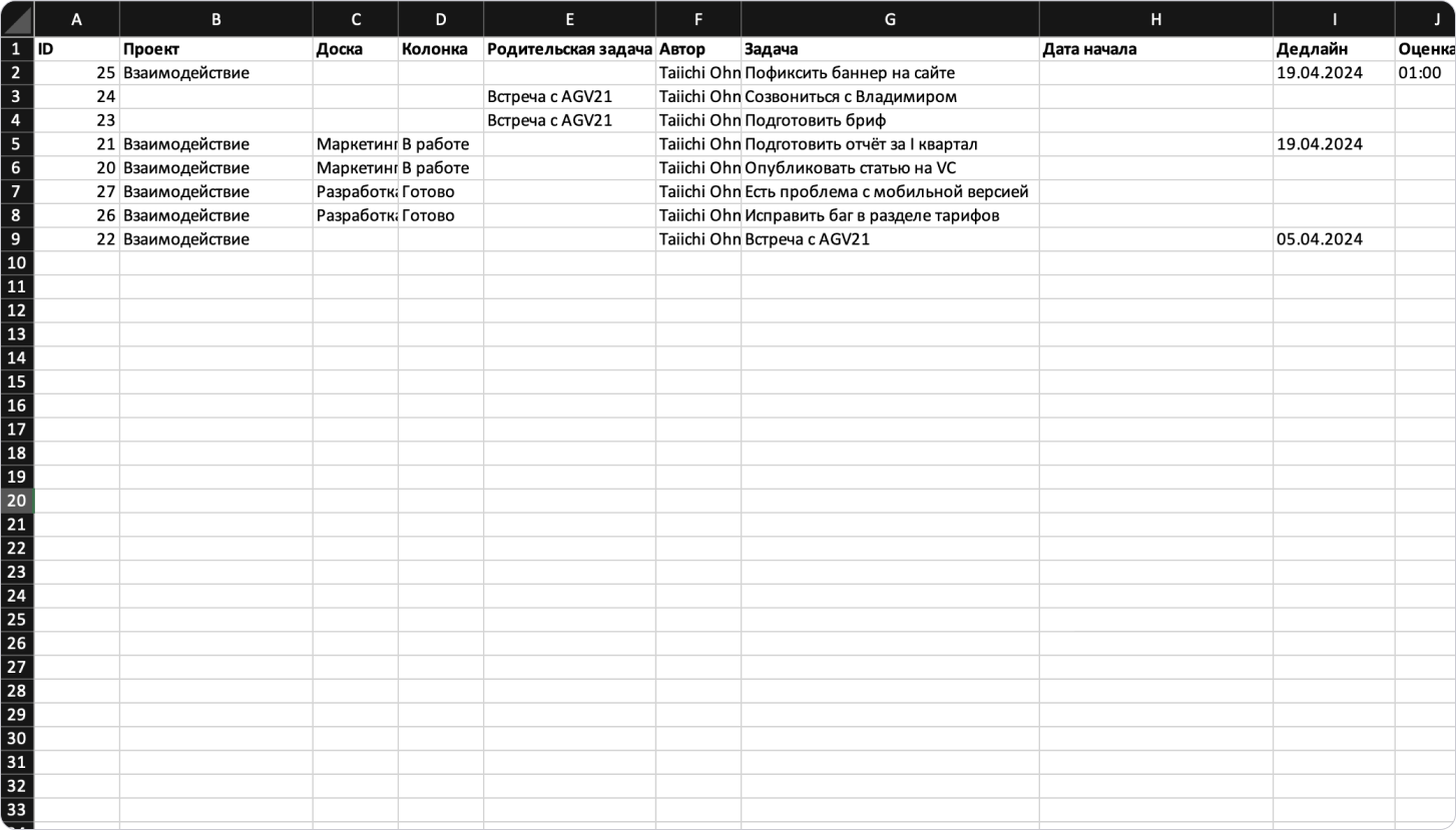 Файл отчёта автоматически загрузится на ваше устройство. Сформированный отчёт содержит информацию о задачах, которые были созданы, выполнены или сроки выполнения которых попадают в указанный период времени.