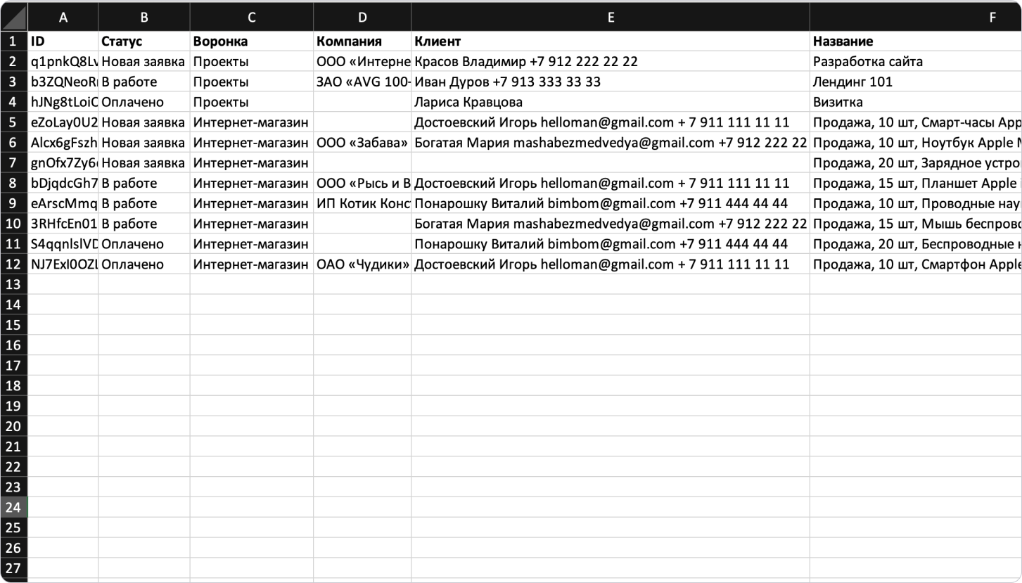 Файл отчёта автоматически загрузится на ваше устройство. Сформированный отчёт содержит информацию о сделках, созданных за указанный период.