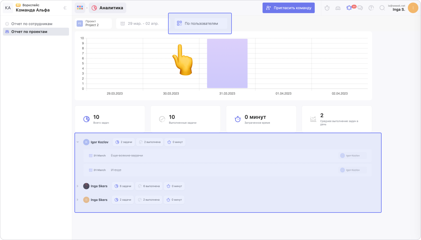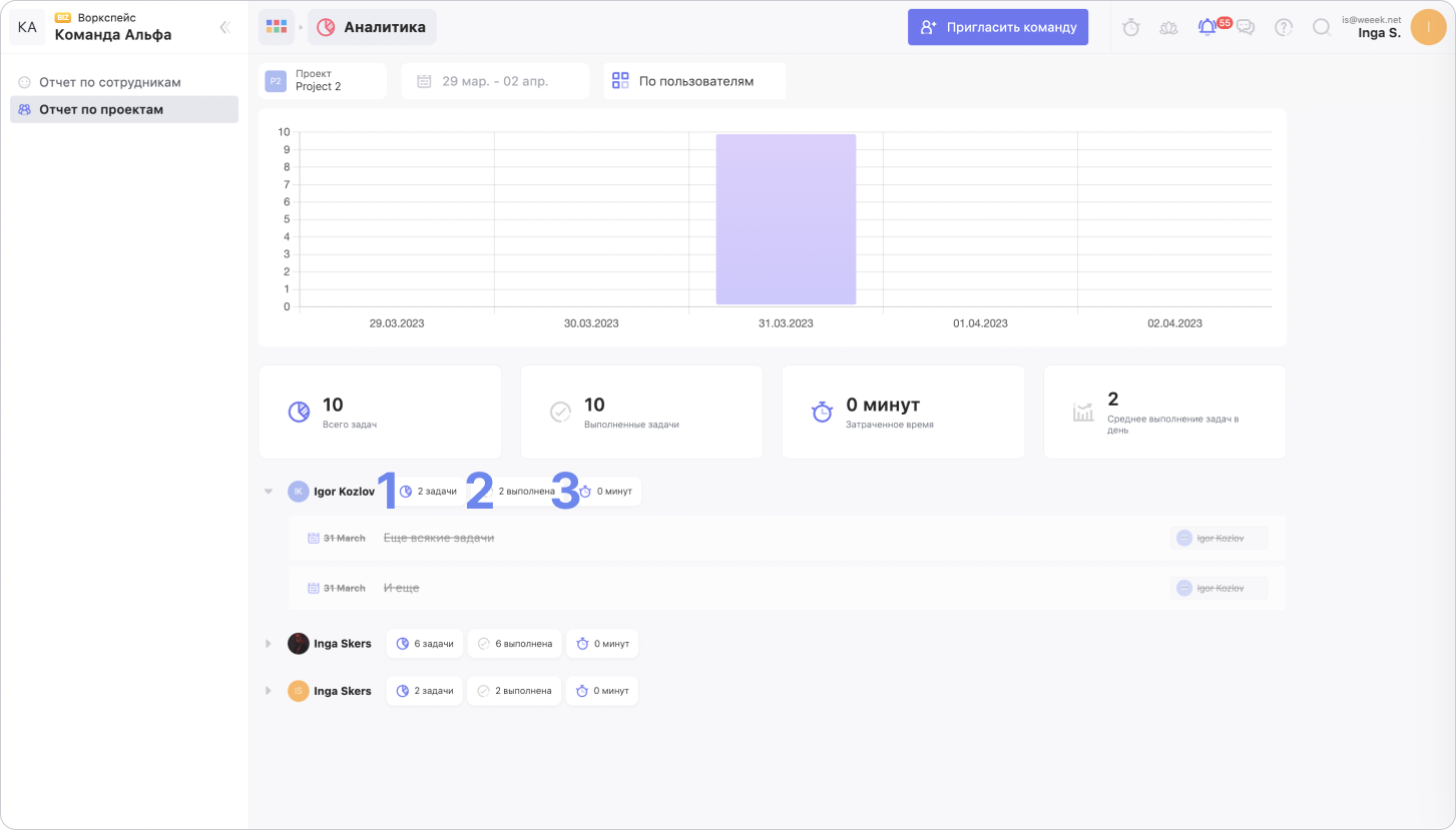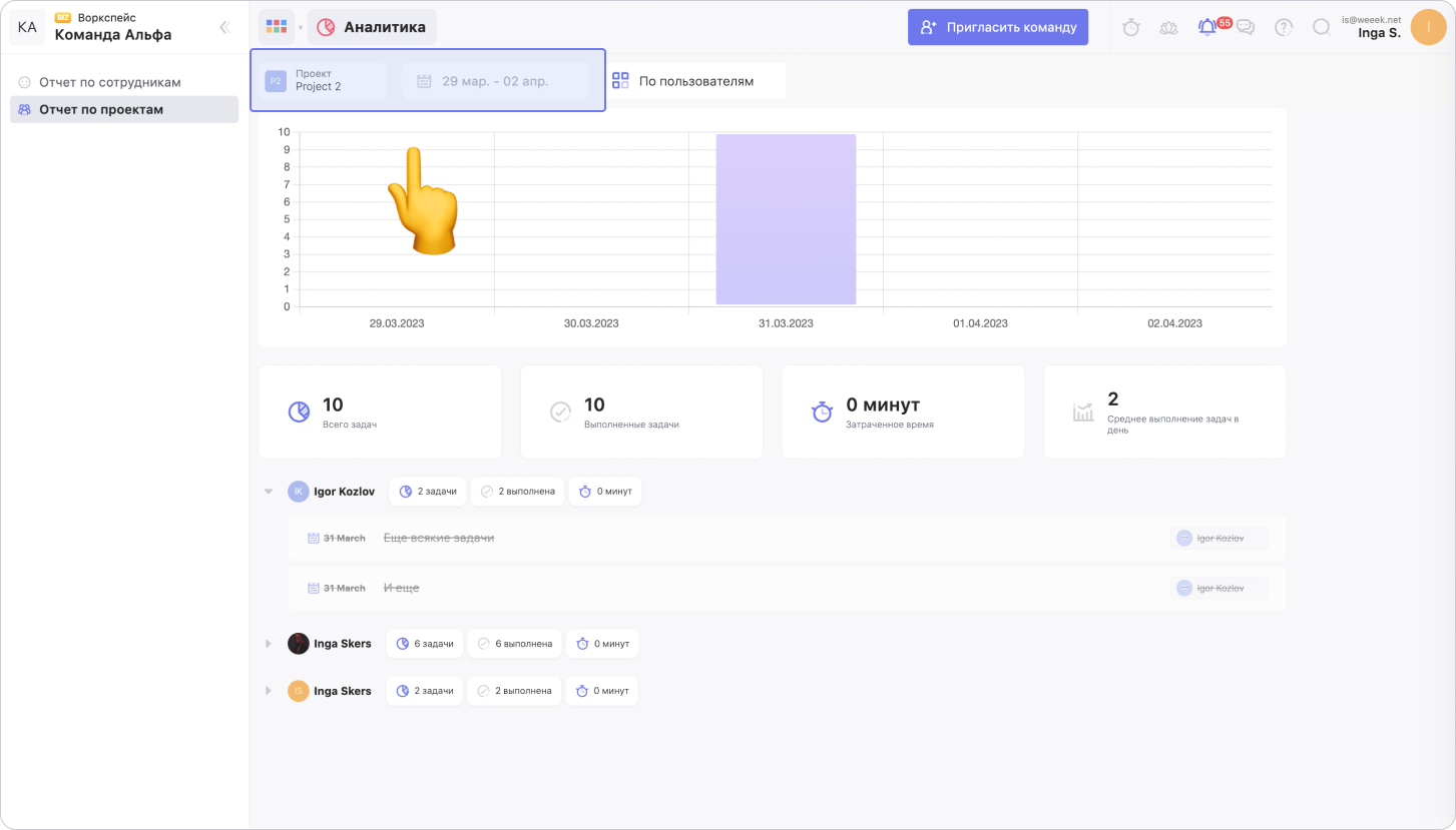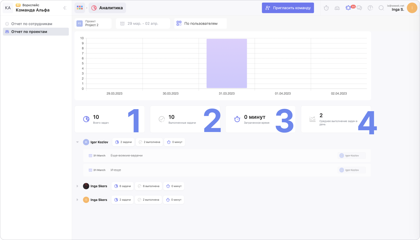 Отчёт по проектам в разделе Аналитика поможет оценить прогресс по конкретному проекту