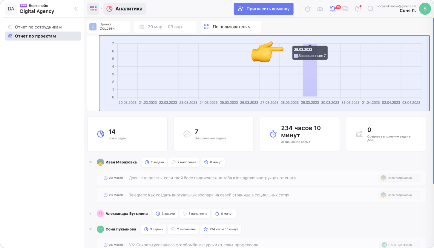 Чтобы просмотреть аналитику, выбери нужный проект и временной промежуток вверху страницы