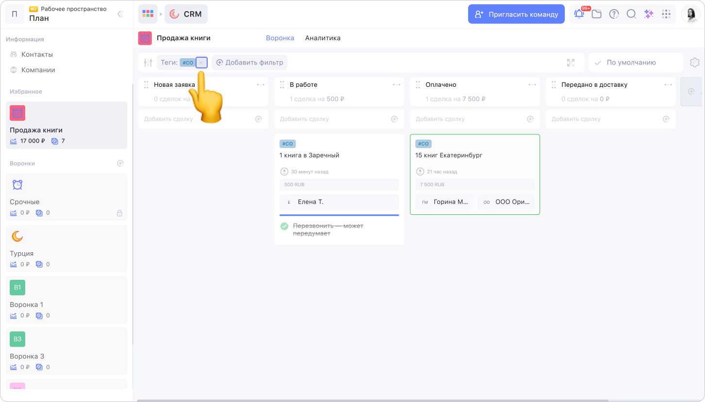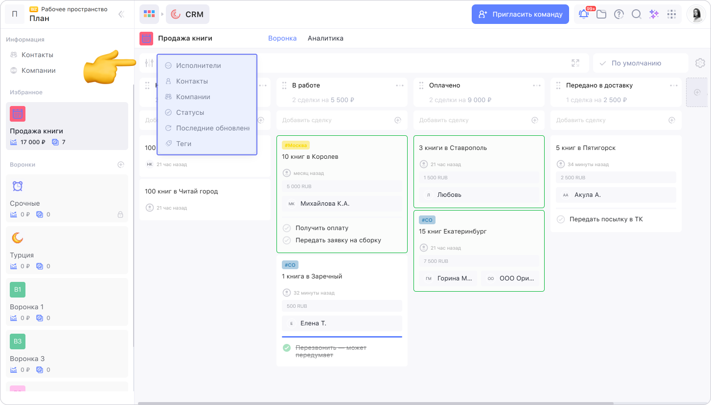 Чтобы удобнее работать со сделками, можно настроить их отображение или сортировку или добавить фильтр.