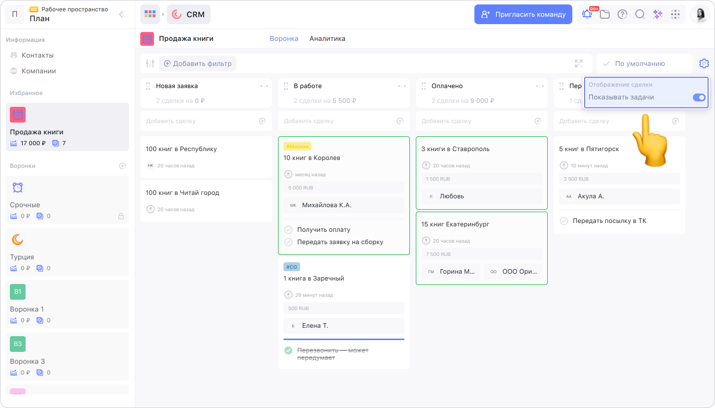 Можно настроить отображение привязанных задач на карточке сделки, чтобы они были видны сразу. Для этого нажмите на шестерёнку в правой части панели инструментов и переключите режим отображения.