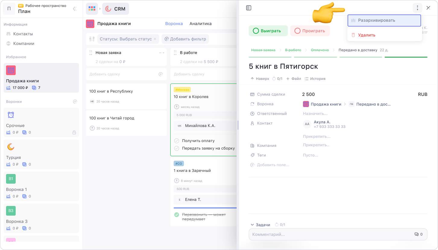 Архивные сделки не удаляются, их можно в любой момент разархивировать. Для этого откройте карточку сделки, нажмите на ⋮ в правом верхнем углу. Выберите Разархивировать.