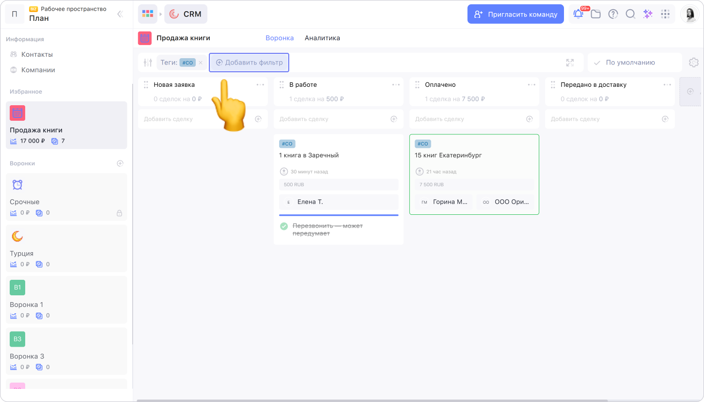 Сделки можно фильтровать по исполнителю, контактам, компаниям, статусам, последним обновлениям и тегам. Чтобы задать фильтр, нажмите Добавить фильтр и выберите условие.