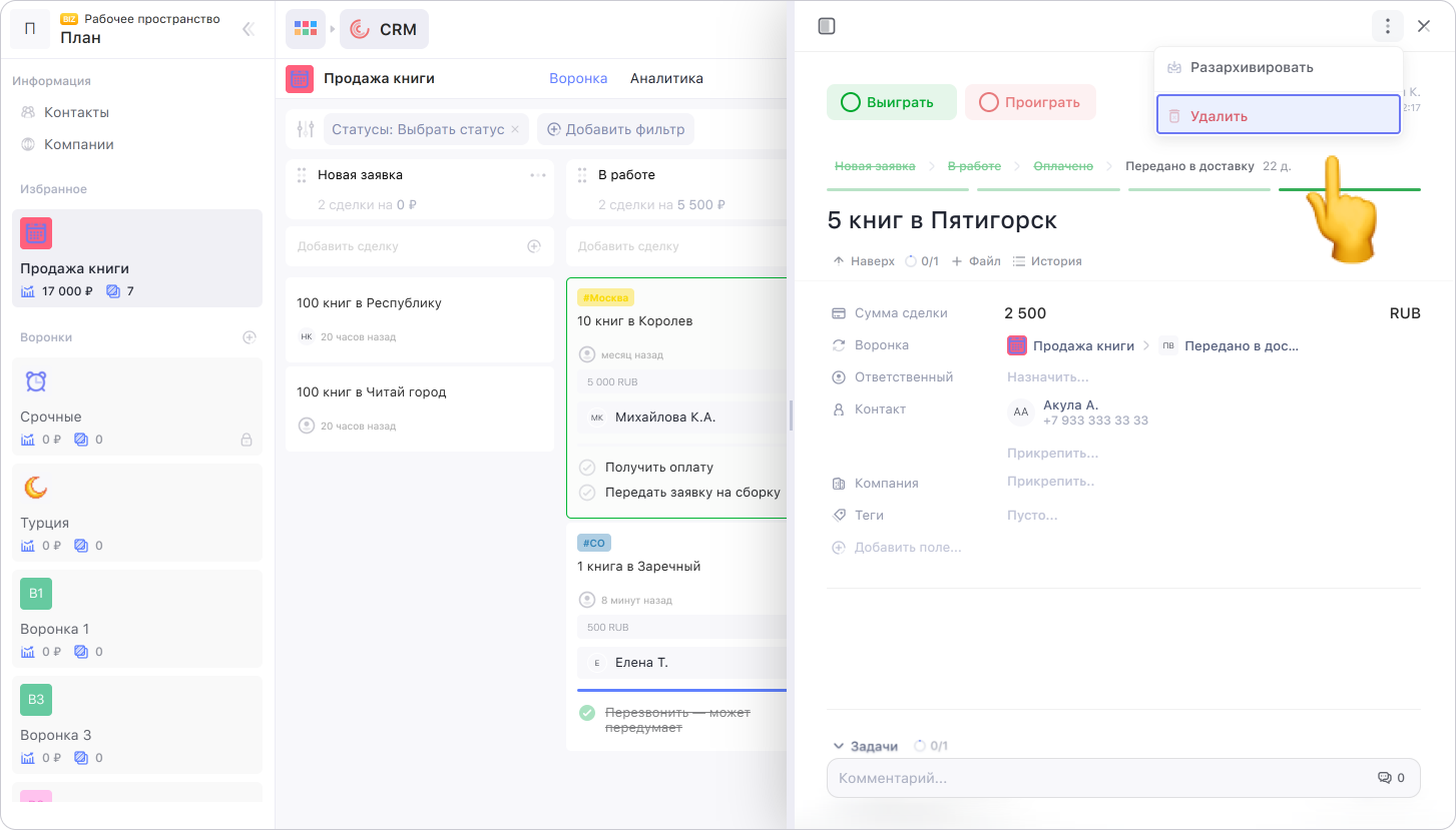 Если сделка создана по ошибке или больше не нужна, её можно удалить. Для этого откройте карточку сделки, нажмите на ⋮ в правом верхнем углу. Выберите Удалить, подтвердите удаление.