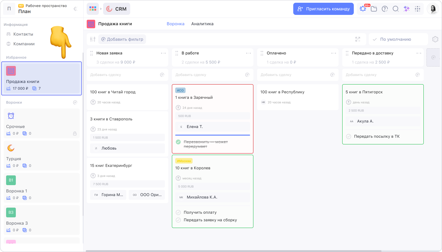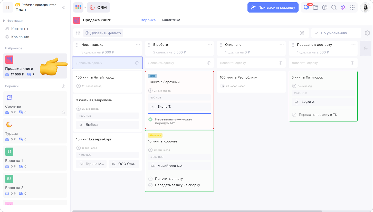 Чтобы просмотреть сделки, нужно выбрать воронку. Сделки распределены по этапам и перемещаются по ним шаг за шагом — как клиент постепенно подходит к покупке.