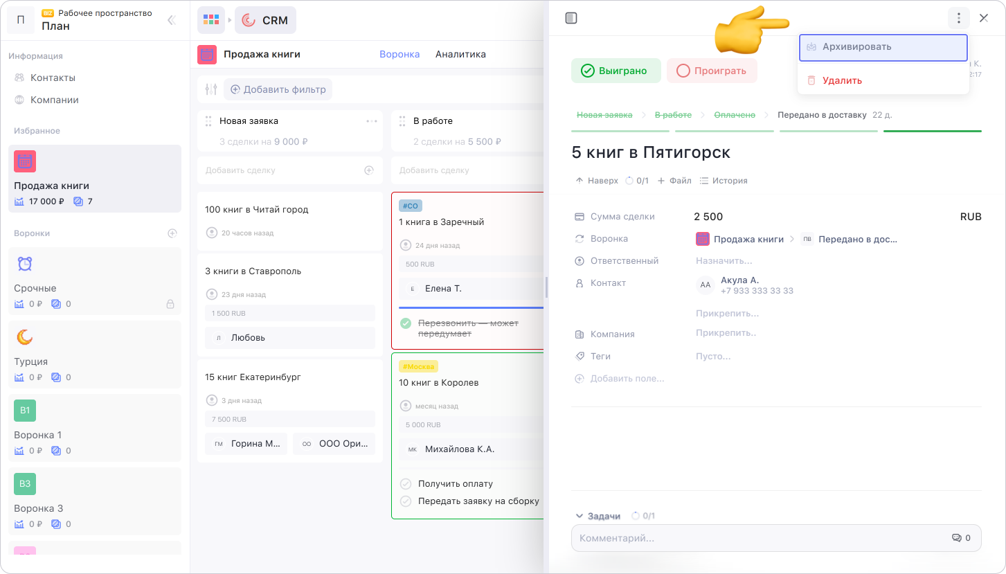 Когда работа по сделке завершена, её можно архивировать. Архивированная сделка останется в списке и с ней можно работать как обычно.