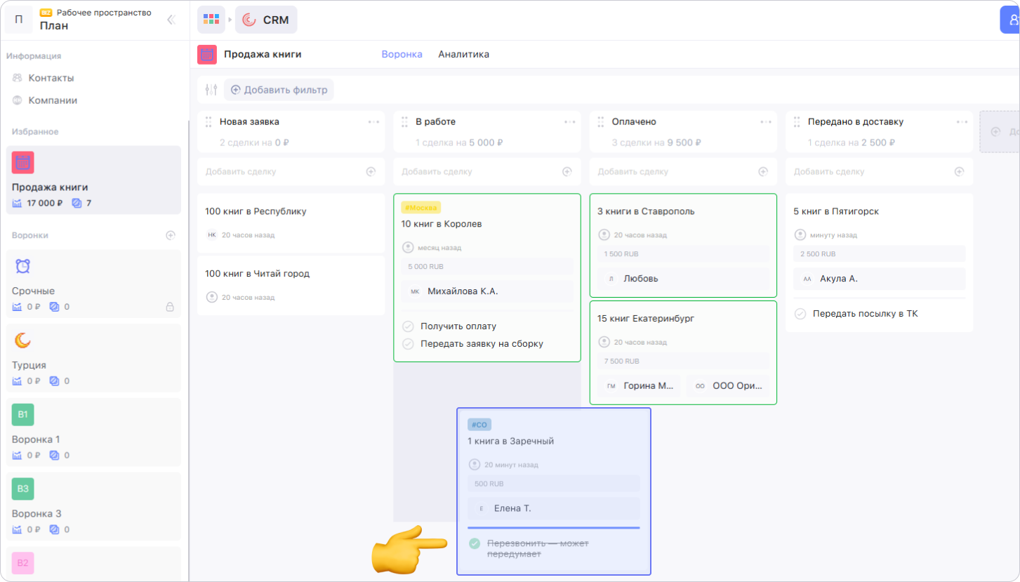 Сделка — это договор между бизнесом и клиентом о покупке товара или услуги. Сделка может завершиться успешно или не состояться.
