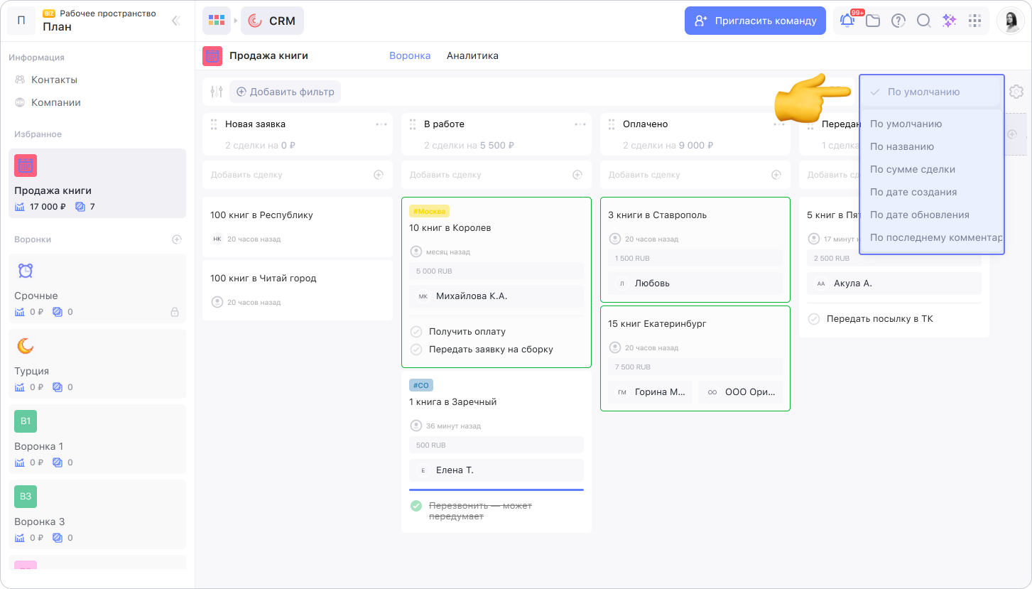 Можно отсортировать сделки по названию, сумме, дате создания или обновления или по последнему комментарию. Чтобы изменить сортировку, нажмите на поле сортировки и выберите нужный вариант.