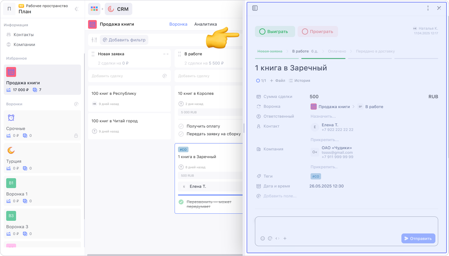 Подробнее о том, как заполнять карточку сделки, читайте в инструкции