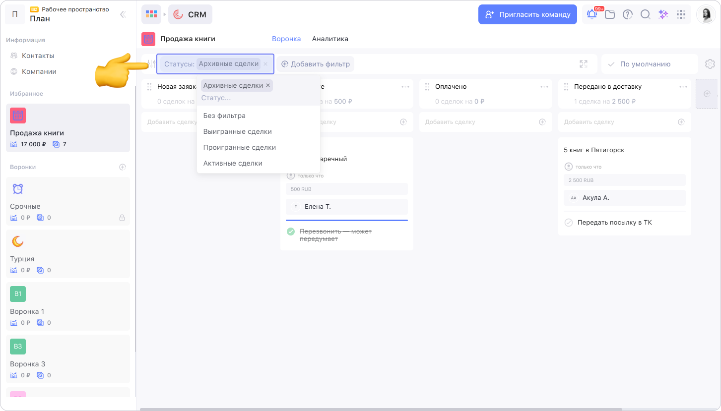 Чтобы посмотреть все архивные сделки, добавьте фильтр по статусу и выберите Архивные сделки.
