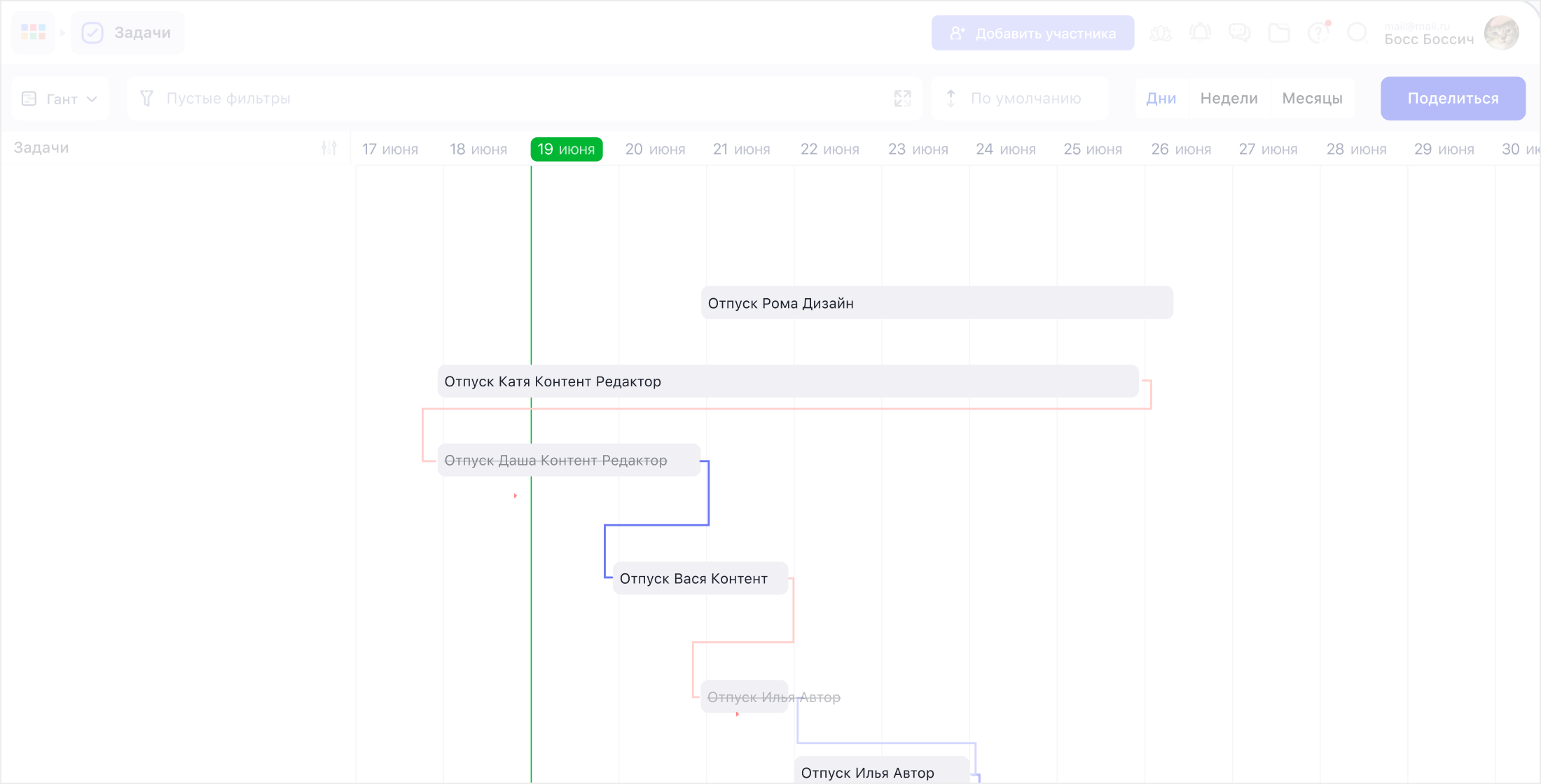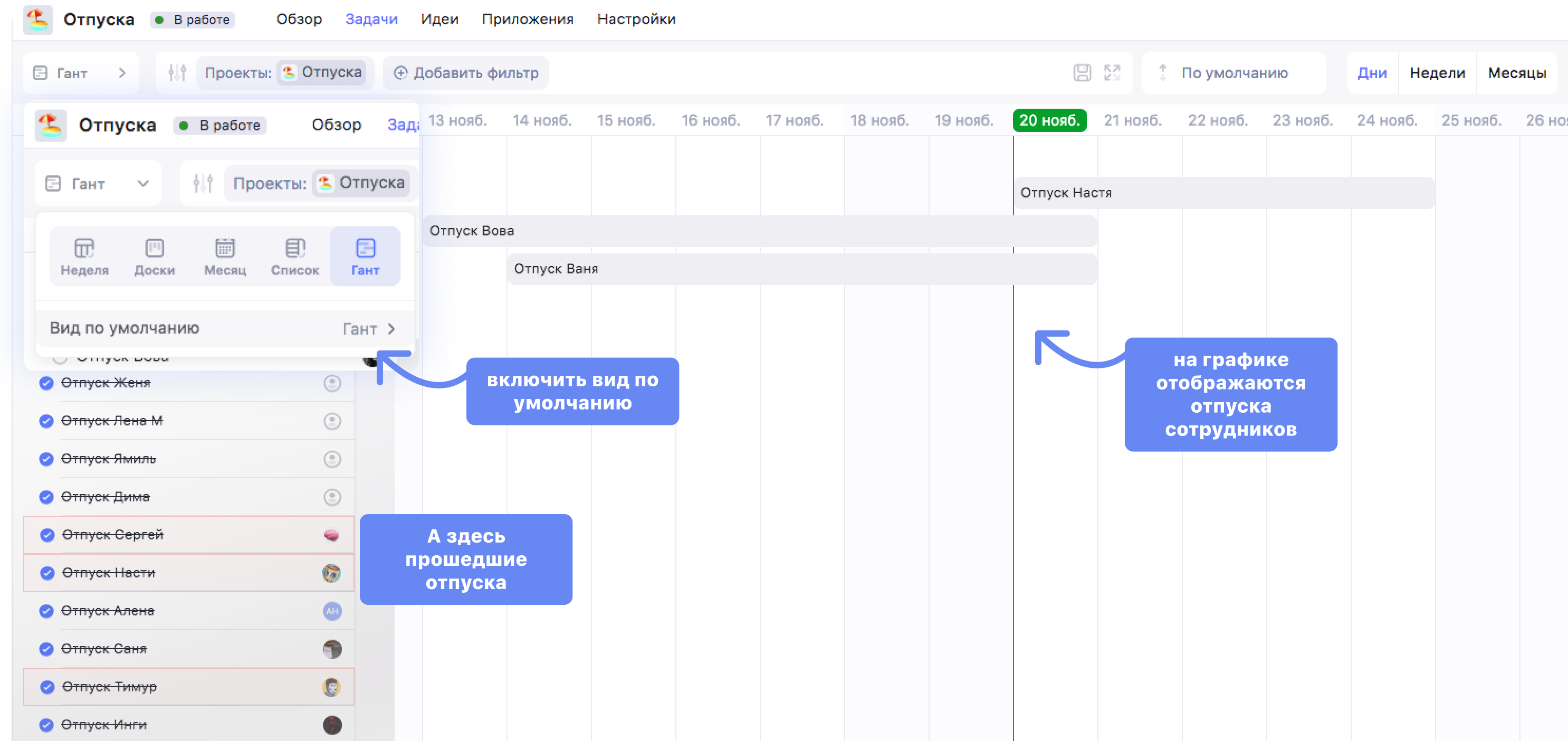 Чем хорош график отпусков на диаграмме Ганта? Он помогает увидеть пересечения отпусков разных сотрудников — если это критично для команды. Когда график отпусков организован внутри таск-менеджера, легче отслеживать доступность сотрудников и принимать управленческие решения: например, заранее передавать другим важные задачи и не накидывать дополнительной работы перед отпуском.