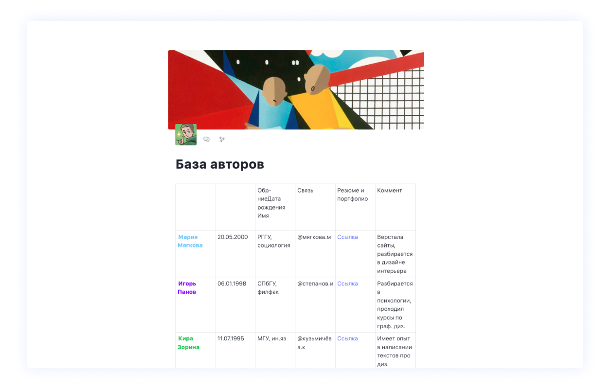 Набирать команду в редакцию и управлять данными о ней удобно с помощью таблицы — базы авторов. Туда входят не только имя, резюме и опыт работы. В базе отражают дополнительные данные об авторе: его специализацию, знания, сильные стороны, наличие контактов в СМИ и другие данные.
