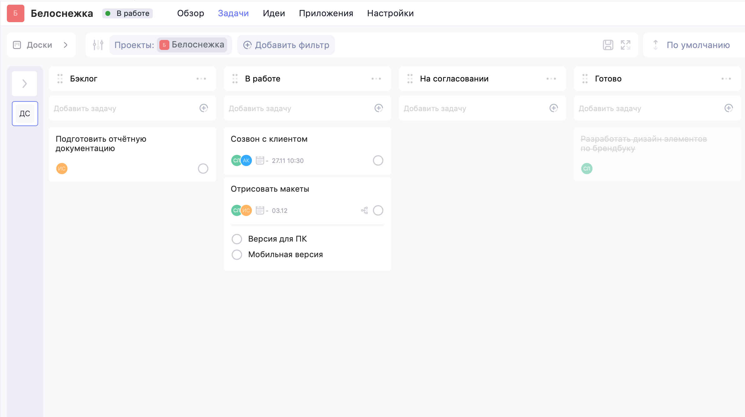 - На согласовании. Пока задача находится в этом статусе, дальнейшая работа зависит от заказчика: он уточняет отдельные моменты или согласовывает законченную работу. Если нужно что-то доработать, задача может вернуться в колонку «В работе».