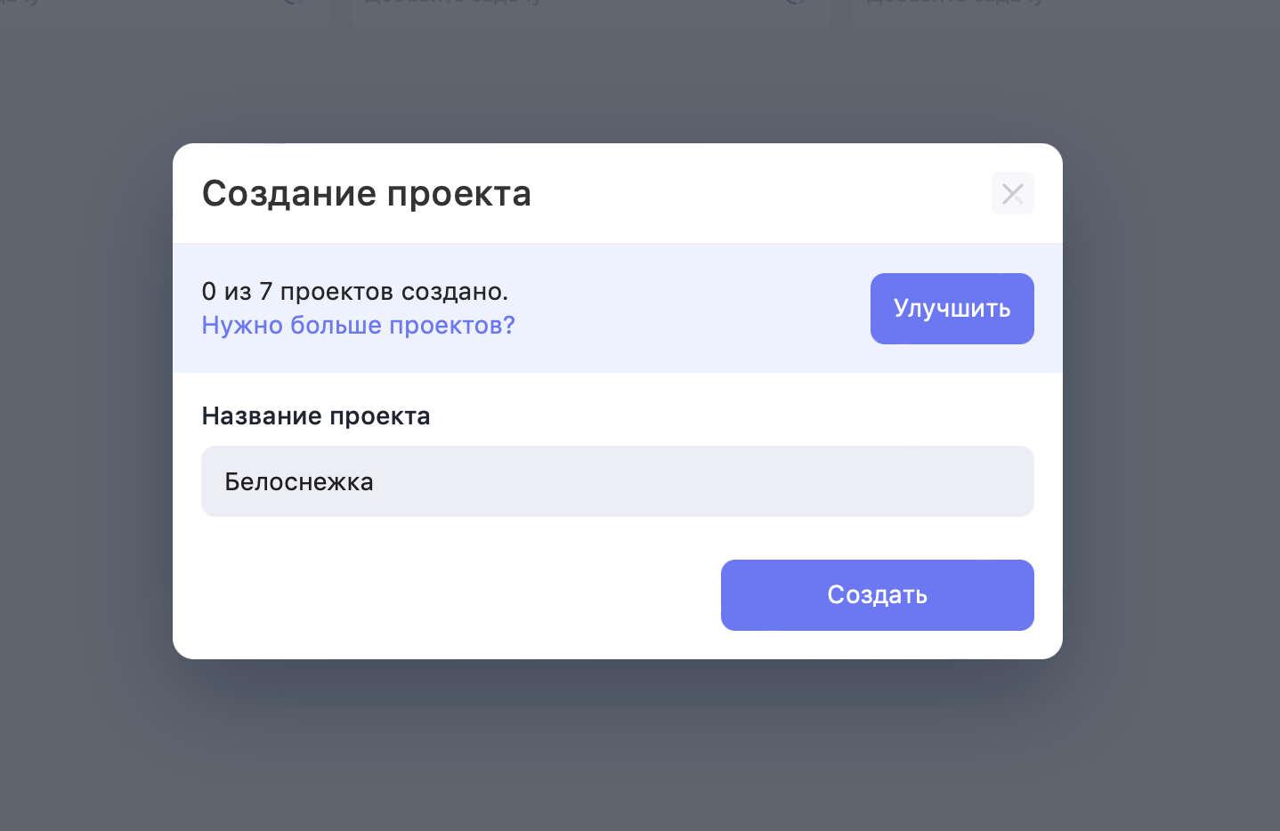 Предположим, что у нашей студии новый заказ — дизайн сайта онлайн-магазина косметики «Белоснежка». Создадим для него проект: это делается в боковом меню сервиса Задачи, по кнопке +.