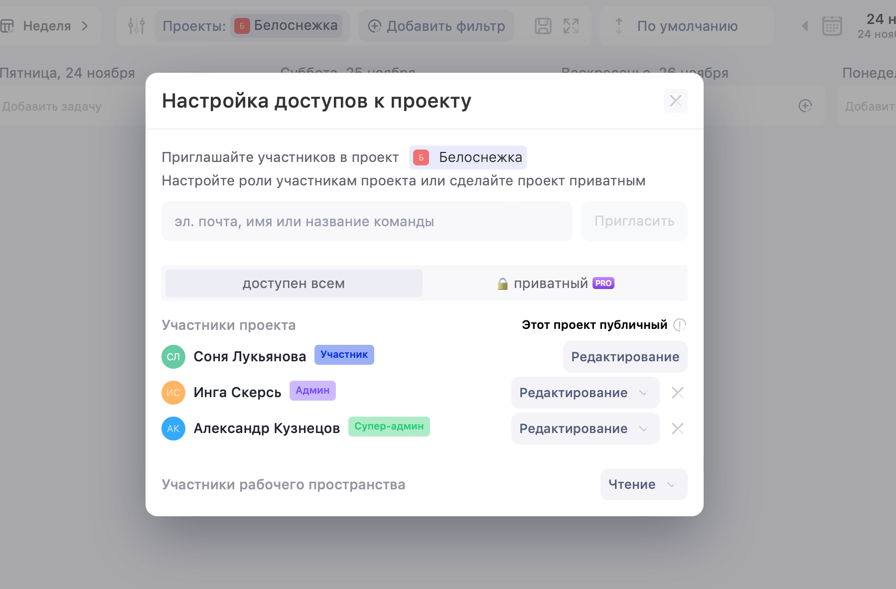 Для каждого участника или команды выбери уровень доступа: чтение, редактирование или комментирование. Если проект публичный, доступ можно настроить и для всех участников пространства.