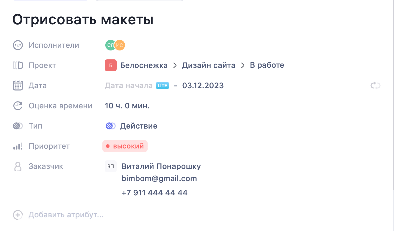 - Кастомные поля. Это атрибуты задачи, которые команда создаёт под свои процессы: например, «Контакт заказчика», «Ссылка на макет», «Согласовано». Подробнее о том, как их использовать, читай в этом материале.