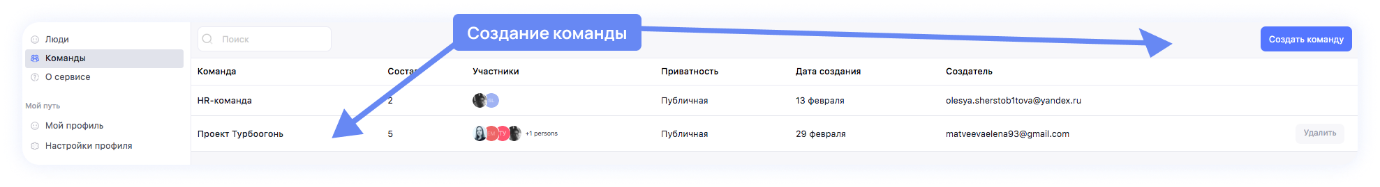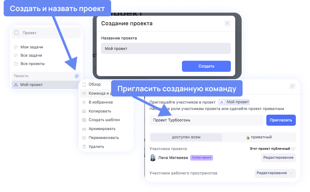 В этот проект сразу можно пригласить команду, сформированную в сервисе Пользователи.