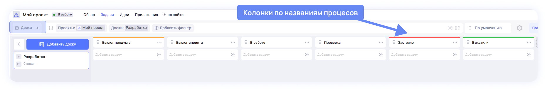 Мы уже описали из зафиксировали процессы на первом шаге, осталось перенести их. В зависимости от специфики бизнеса, колонок может быть больше, допустим — Бэклог на месяц, Бэклог на неделю, На проверке, В заморозке.
