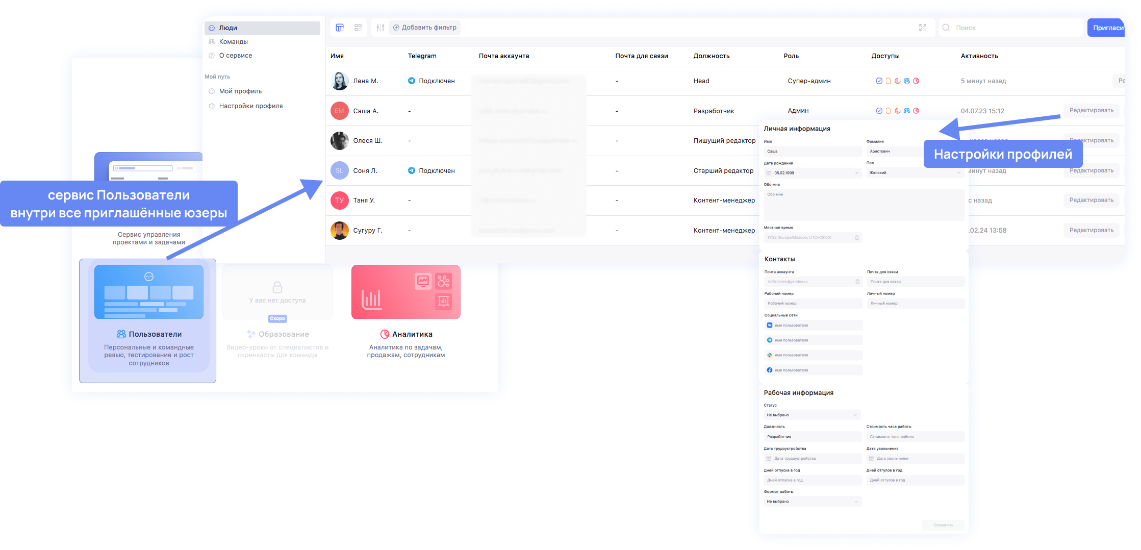 В сервисе Пользователи оформи карточки сотрудников. Пропиши должности, имена. Это минимум — а внутри можно отредактировать ещё часы работы, контактные данные, дату увольнения и найма.