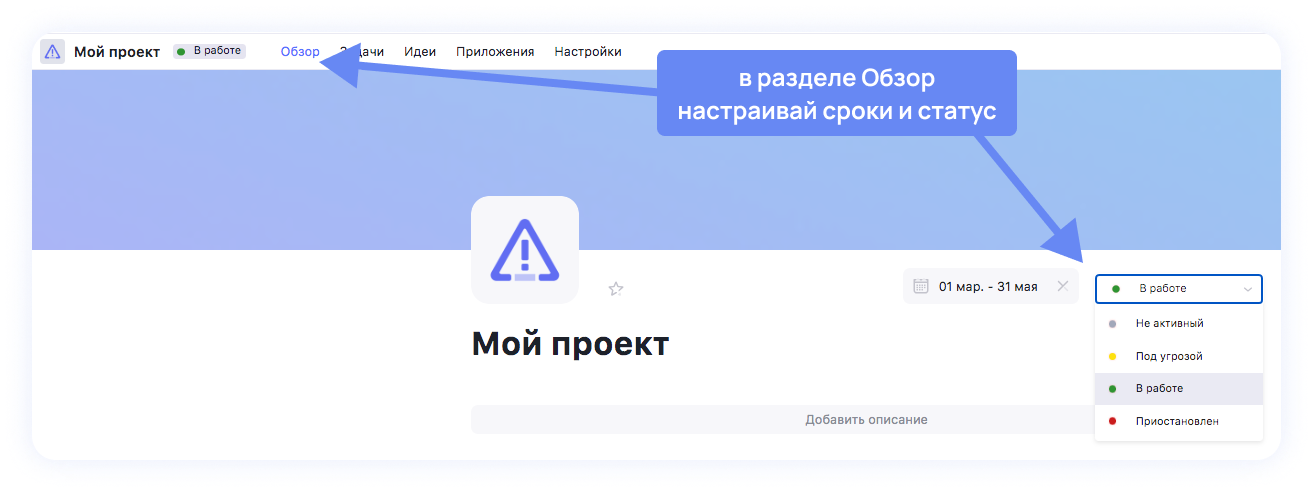 Первый уровень планирования сроков — в настройке проекта. Заходи в раздел Обзор на верхней панели проекта. Там в поле даты настрой сроки. Идеально, если проект очерчен временными рамками.