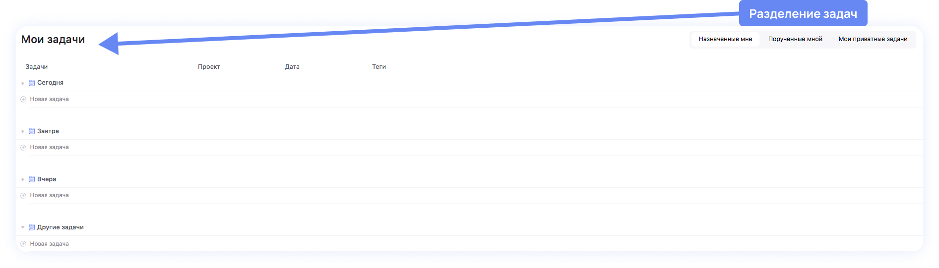 Если нужно увидеть собственные задачи — переходи в раздел Мои задачи. Здесь откроется список твоих задач, а справа найдёшь три вкладки: Назначенные мне, Порученные мной, Мои приватные задачи.