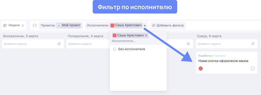 💡 В этих режимах удобно отслеживать занятость сотрудников. Для этого установи фильтр по нужному Исполнителю.