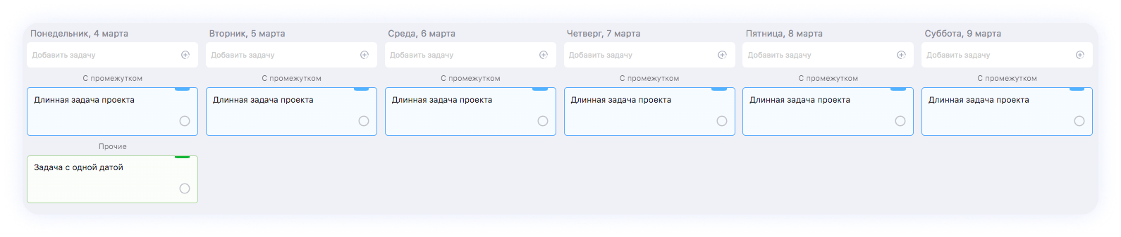 Если задача длительная, выбери начало и дедлайн — то есть сделай длинную задачу. Такая задача отобразится во всех днях календаря по указанным датам.