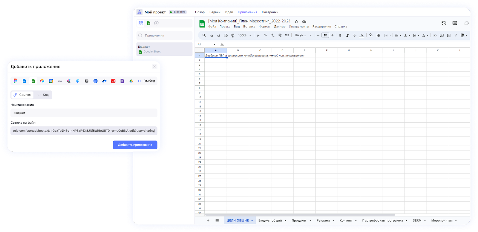 Перейди в раздел Приложения — он находится на верхней панели над проектом. Сюда через ссылку или вставку embed-кода добавляй сторонние приложения: гугл-документы, таблицы, ментальные карты из Miro, Figma.