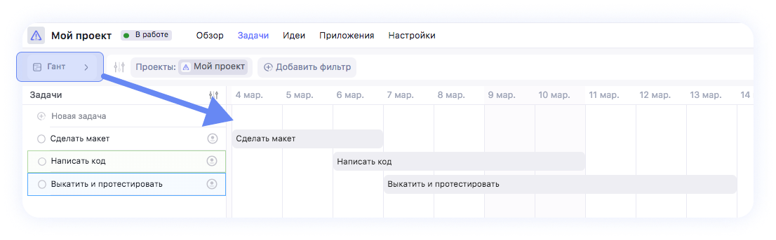 На таймлайне указаны сроки всех проектов рабочего пространства. Этот поможет контролировать несколько проектов с разными или пересекающимися сроками.