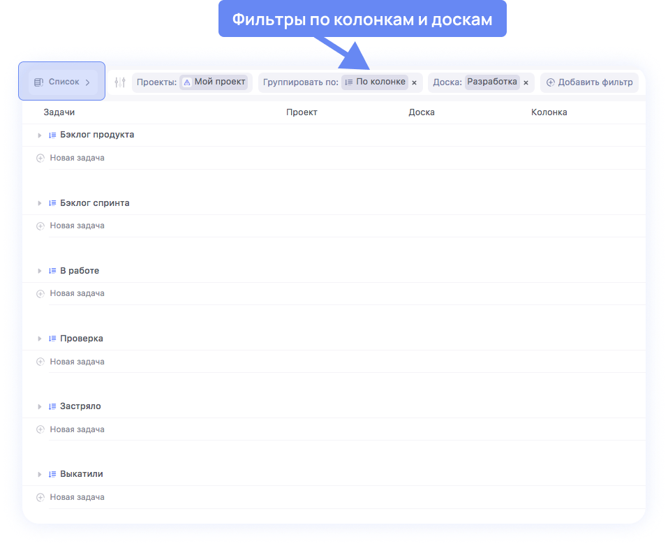 Если тебе нужно проверить перечень дел на день, используй режим Список. Здесь можно дополнительно сгруппировать задачи по проектам, статусам и по доскам.