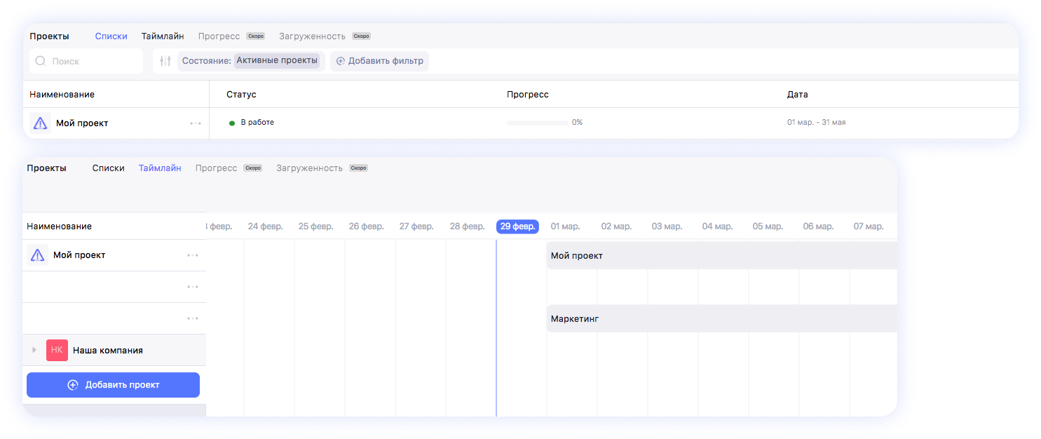 В разделе «Все проекты» есть две вкладки — Список и Таймлайн.