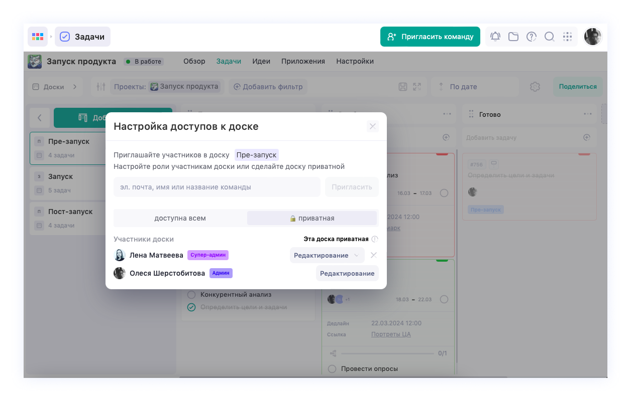 - Настраиваем приватность. Можно добавить нужных пользователей или команды, выставить уровни доступа, сделать доску приватной.