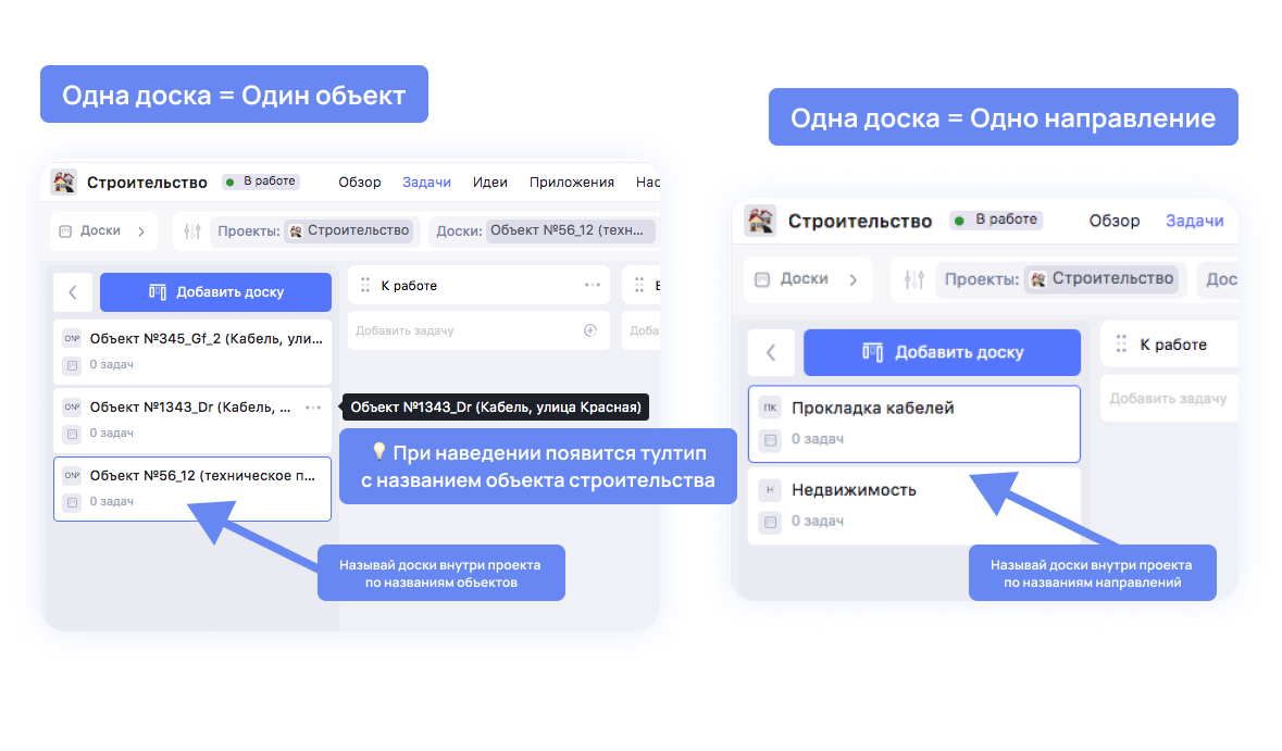 - Одна доска = одно направление объектов. К примеру, направления Прокладка кабелей и Недвижимость. В этом случае полное название объекта лучше отразить в названии задачи. И название колонок на досках — то есть статусы, могут отличаться в разных досках.