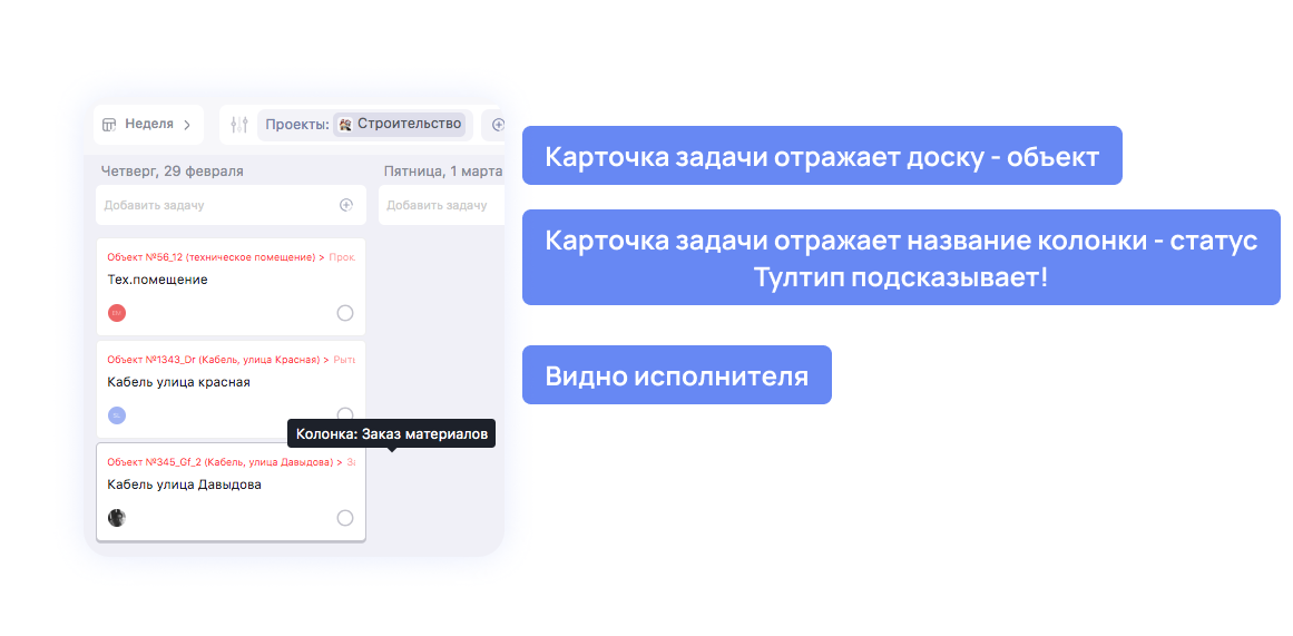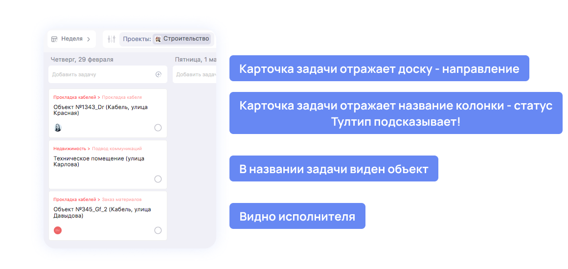 Если выбираешь способ организации «Одна доска = Один объект», то ты будешь видеть карточки задач с указанием названия доски (объект) и колонки (статус, этап выполнения задачи).