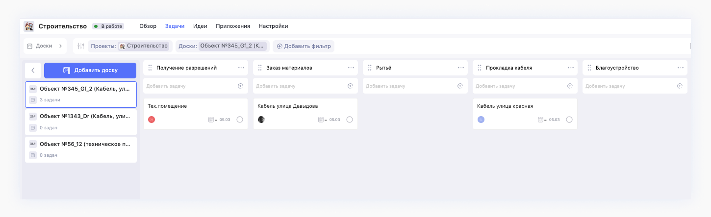 Ниже показываем, как организовать объекты строительства внутри одного проекта на Канбан-досках.