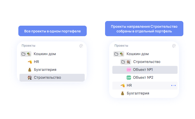 💡 Также ты можешь организовать проекты по портфелям — группам проектов, которые можно отслеживать вместе. Портфельная организация даёт больше функций, чем организация по папкам. Папки просто наводят визуальный порядок, портфели же позволяют организовать проекты, сделать ступенчатую иерархию портфелей и анализировать суммарный прогресс проектов. Доступно с тарифа Бизнес.
