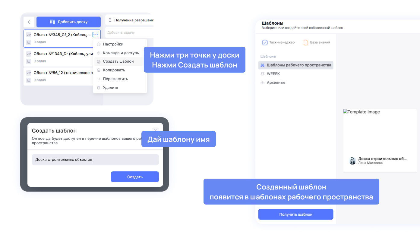 💡 Чтобы каждый раз не создавать с нуля доску, сделай заготовку с прописанными названиями колонок — копируй его, меняй название доски, и всё. Также ты можешь сделать шаблон для своего рабочего пространства.