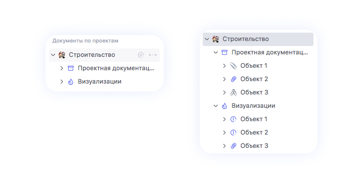 В Базе знаний документы организованы древовидно, как проекты в таск-менеджере. Ты сразу увидишь нужный проект «Строительство».