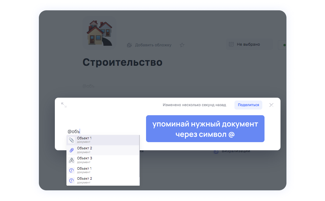 Чтобы «подтянуть» документ к проекту, используй символ @ и выбери в выпадающем списке нужный документ. Так ты можешь упомянуть документ в описании проекта, в задаче, в комментарии.