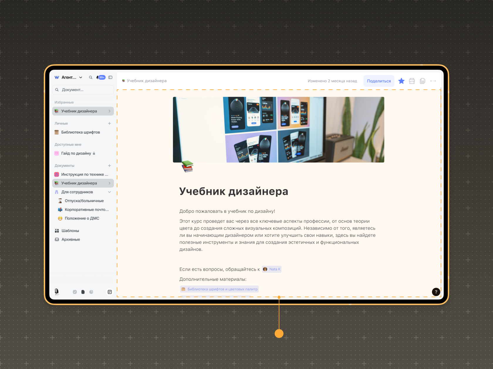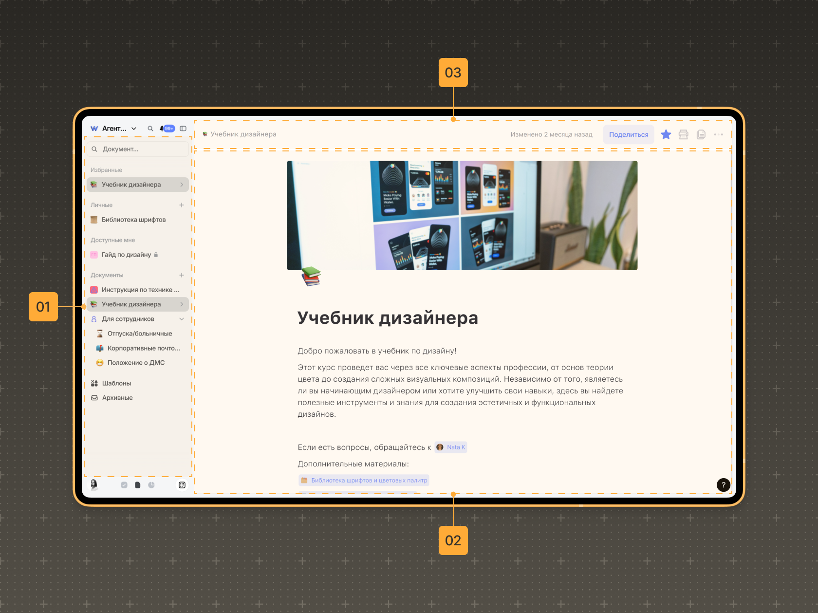 Рабочая область документа — это место для просмотра и редактирования документа. Здесь можно добавлять текст, изображения и видео, менять форматирование, выбрать название и обложку, а также оставлять комментарии.