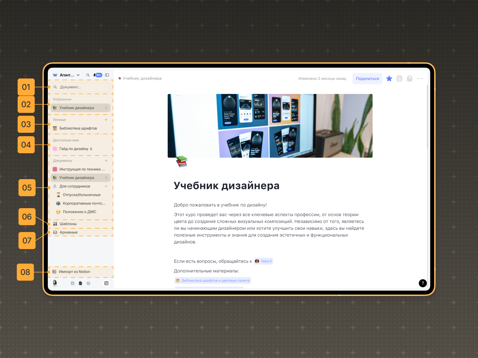 База знаний в Weeek — это сервис для создания и хранения документов внутри рабочего пространства: регламентов, инструкций, отчётов, конспектов и многого другого. В Базе знаний можно строить древовидную структуру документов, добавлять изображения и видео, делиться документами с коллегами и в публичном пространстве.