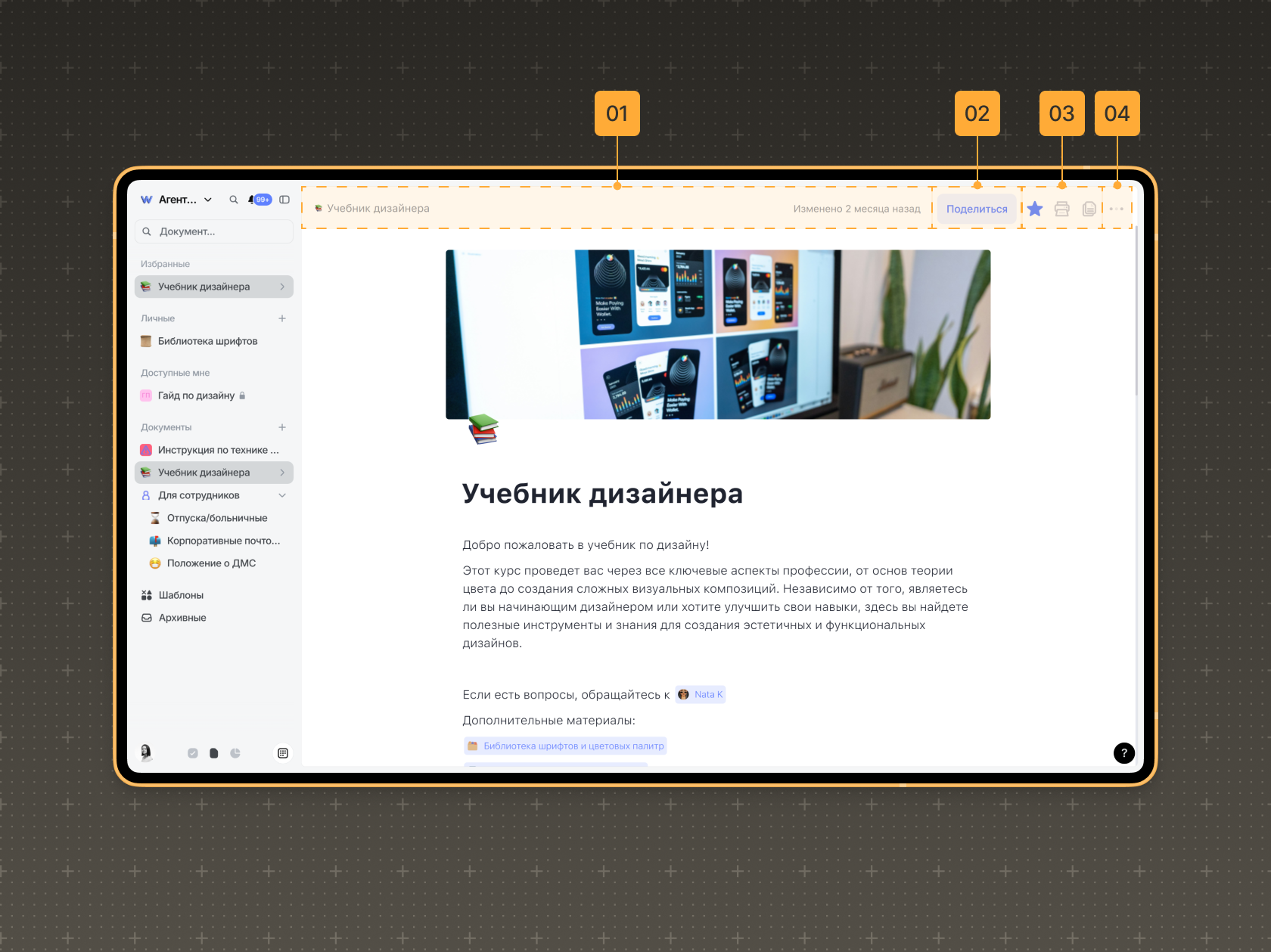 3. Кнопки для быстрых действий с документом: добавить в избранное, распечатать документ прямо из Weeek, в один клик скопировать документ целиком.