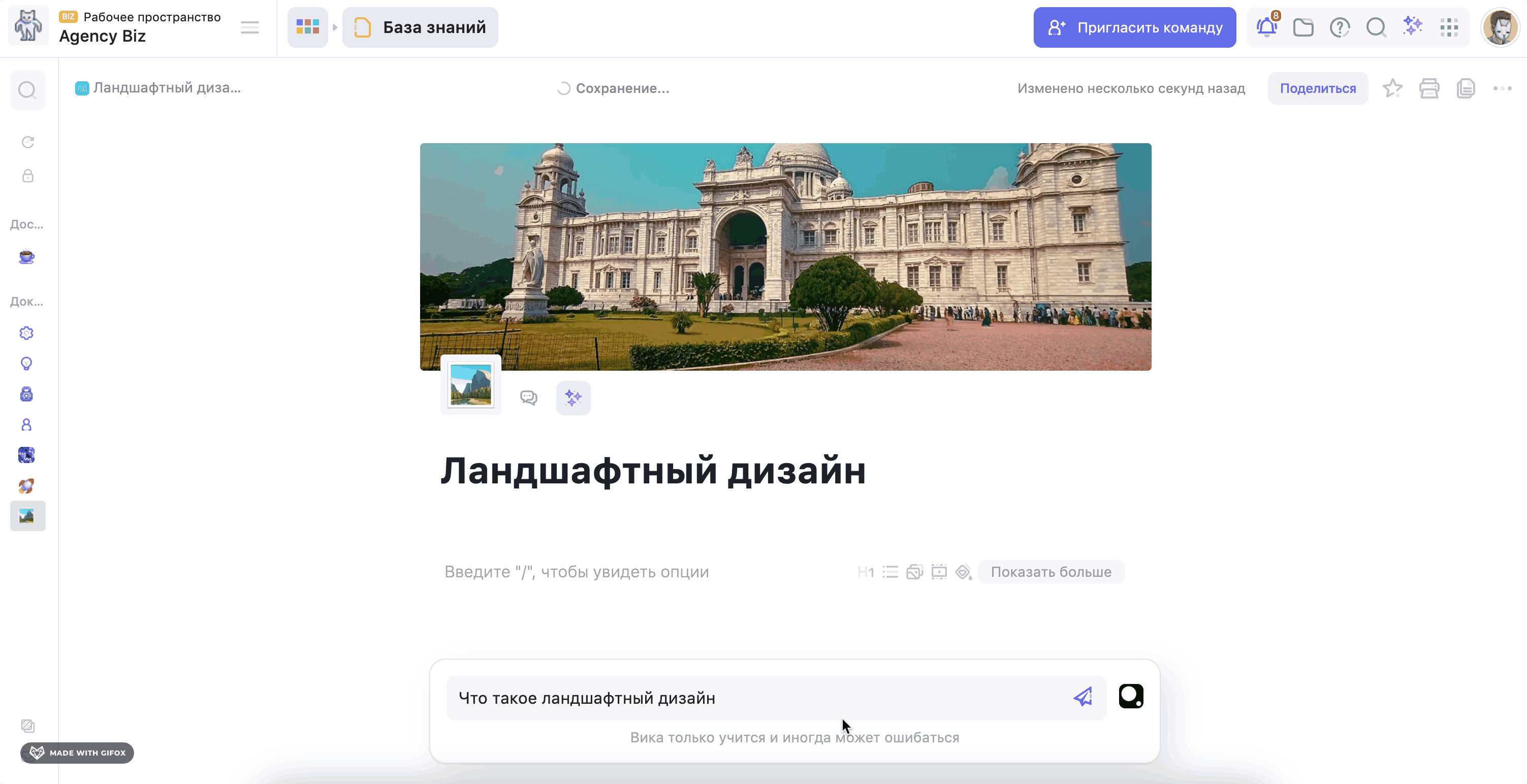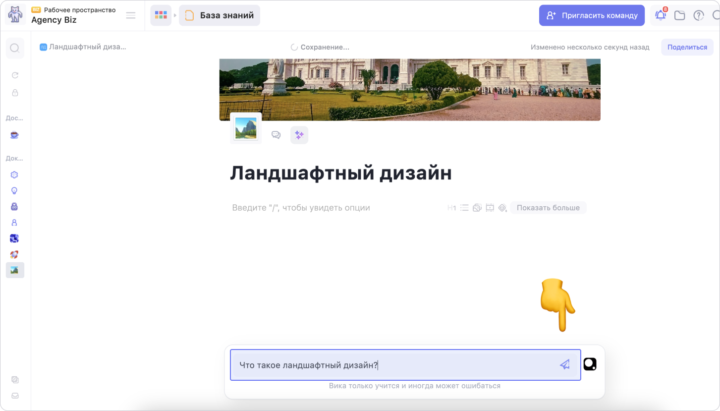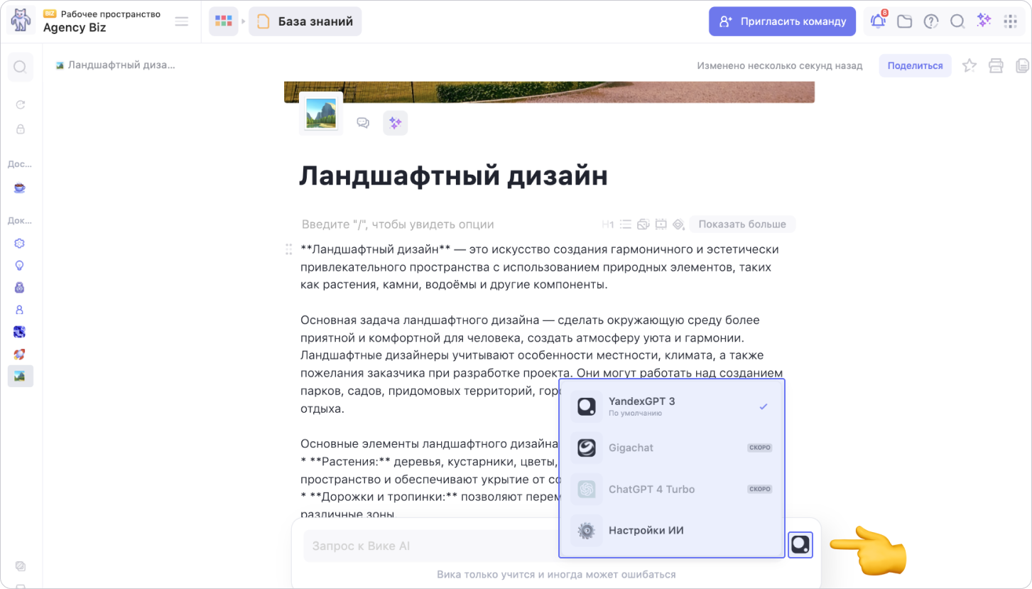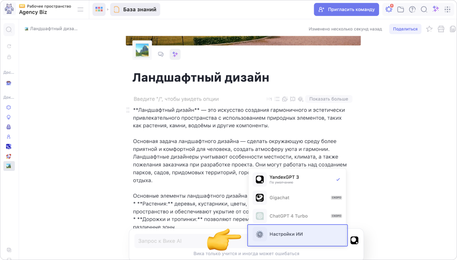 С помощью AI-ассистента Вики в Базе знаний можно генерировать тексты, получать ответы на вопросы и быстро находить нужную информацию. Используй Вику для создания контента, отчётов и оптимизации рабочего процесса