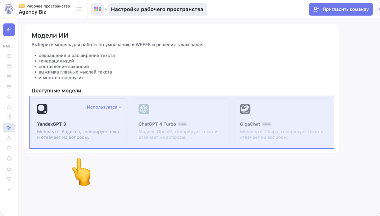 Ты также можешь настроить модель по умолчанию. Для этого перейди в раздел Настройки ИИ