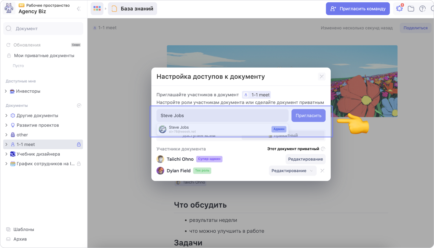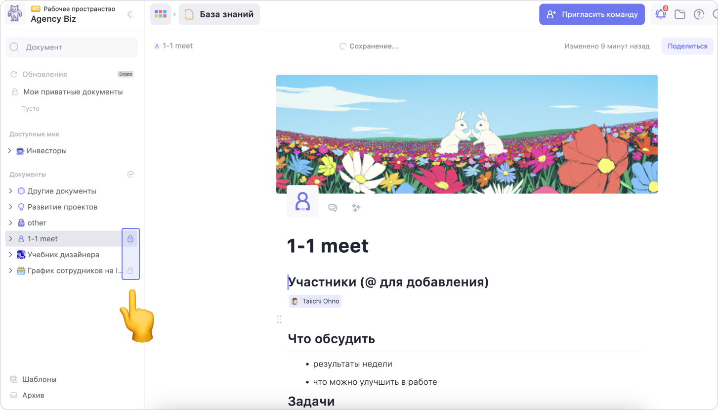 Приватность документа позволяет ограничить доступ к документам среди участников рабочего пространства. Так ты можешь создавать документы для разных отделов и уровней ответственности, обеспечивая нужный уровень конфиденциальности. Чтобы создать личный документ, доступный только тебе, воспользуйся разделом Мои приватные документы